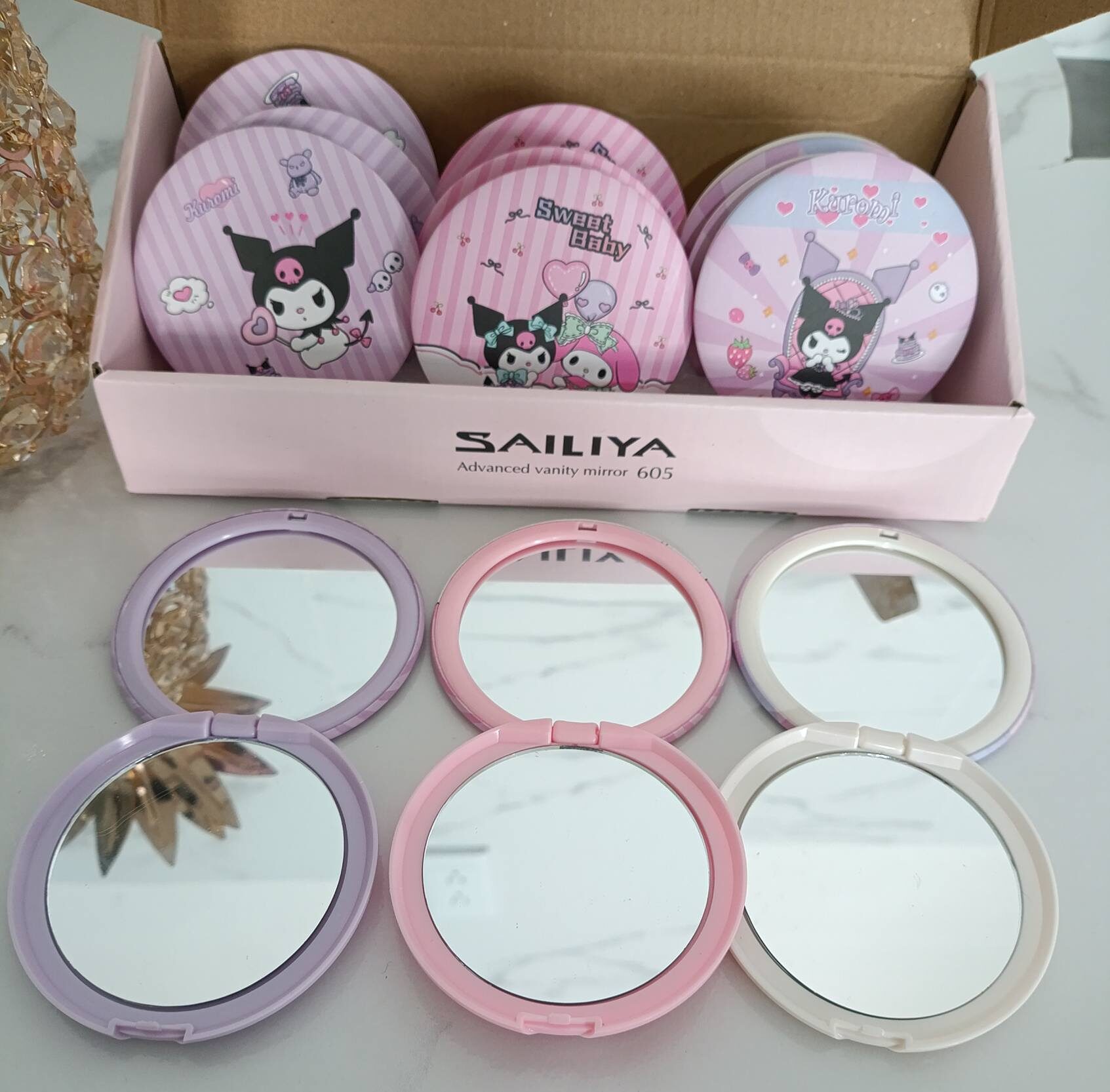 Espejo compacto de bolsillo con diseño del personaje Kuromi, ideal para retoques rápidos en cualquier momento. Cuenta con doble espejo (normal y aumento), perfecto para maquillaje, cuidado personal o uso diario.