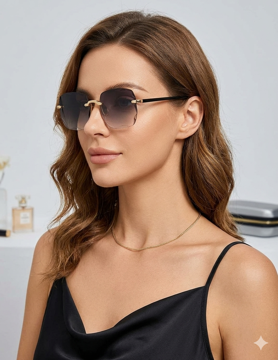 Descripción: Define tu estilo con estas exclusivas gafas de sol de diseño sin montura (rimless). Su característica principal son las lentes con borde de corte irregular, que simulan la precisión de un diamante, aportando un brillo y sofisticación únicos a tu rostro. Con un degradado sutil en tonos humo y detalles en dorado metálico, estas gafas son el accesorio definitivo para la mujer moderna que busca destacar con elegancia y un toque de vanguardia.